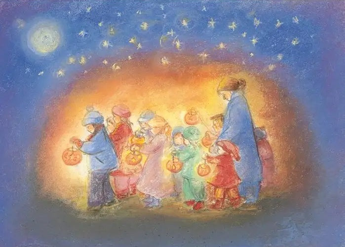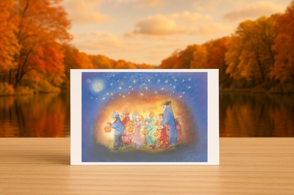 Sprekende, sprookjesachtige kaart met van een optocht tijdens Sint Maarten. Geschikt om te verzenden, maar ook heel sfeervol op je seizoenstafel of in een kaartenstandaard!