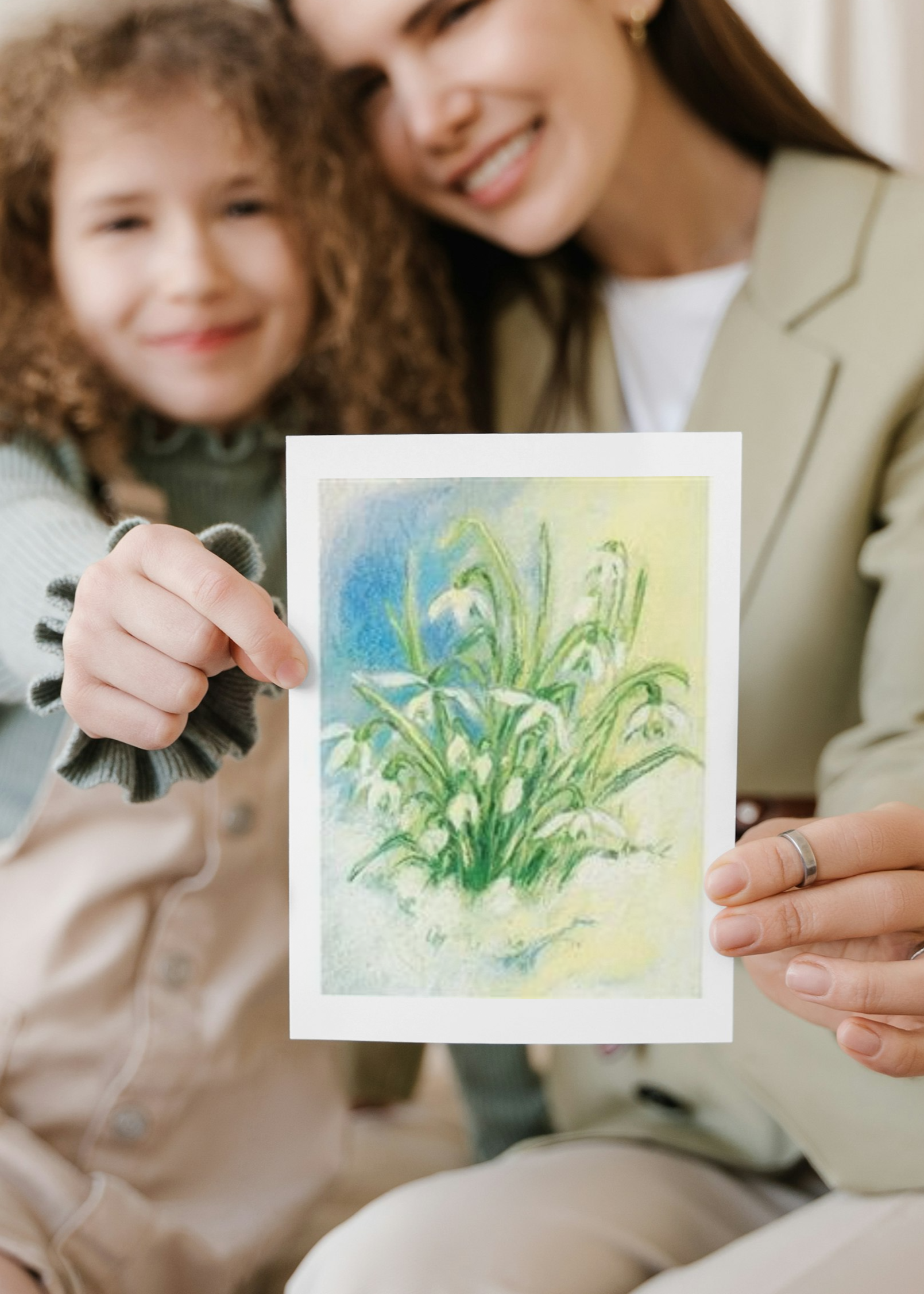Sprekende, sprookjesachtige kaart met sneeuwklokjes. Geschikt om te verzenden, maar ook heel sfeervol op je seizoenstafel of in een kaartenstandaard!