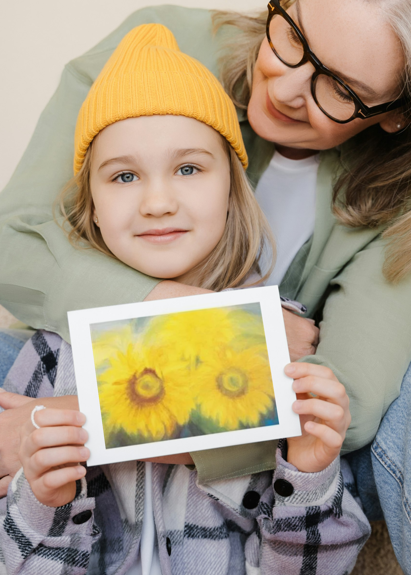 Sprekende, sprookjesachtige kaart met zonnebloemen. Geschikt om te verzenden, maar ook heel sfeervol op je seizoenstafel of in een kaartenstandaard!